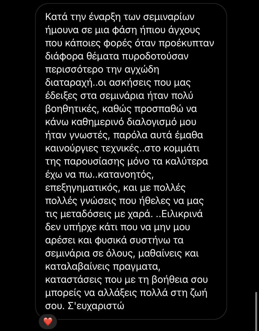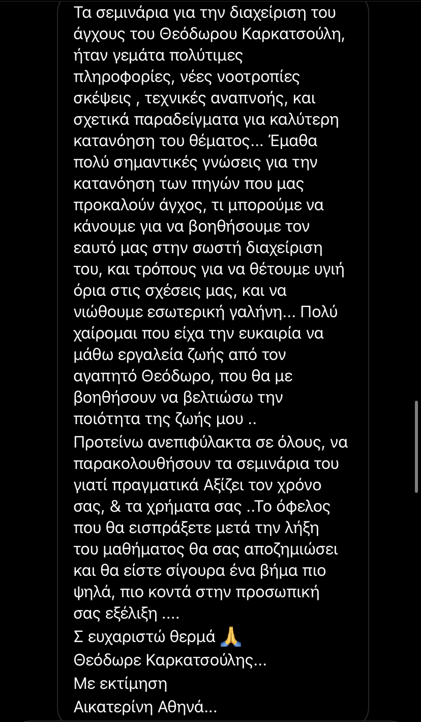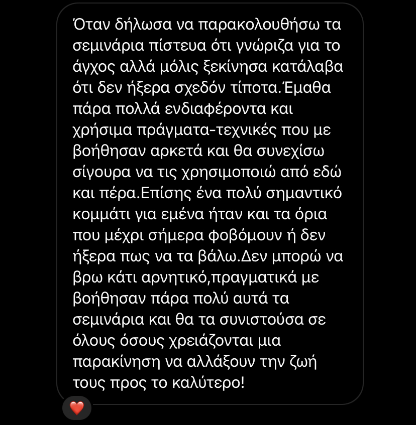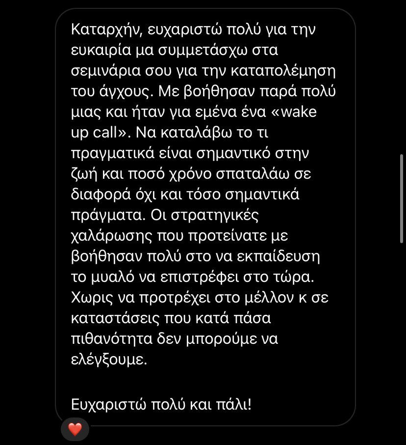 Αυτοί που μαθαίνουν να διαχειρίζονται το άγχος μέσα από τις τεχνικές και τις ασκήσεις που θα κάνουμε μαζί, αναφέρουν τα εξής: